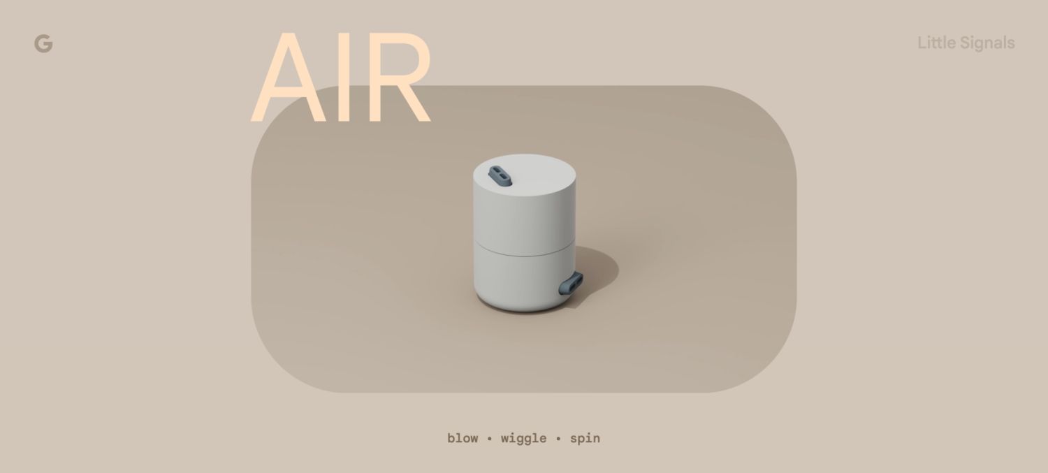 El aire funciona con el aire y puede crear suaves ráfagas de viento. El objetivo no es "sorprender" al usuario como un fanático, sino hacer que otras cosas se muevan. Por ejemplo, 'Aire' podría colocarse junto a una planta que se mueve como señal transmisora. Además, Air puede girar y tambalearse.