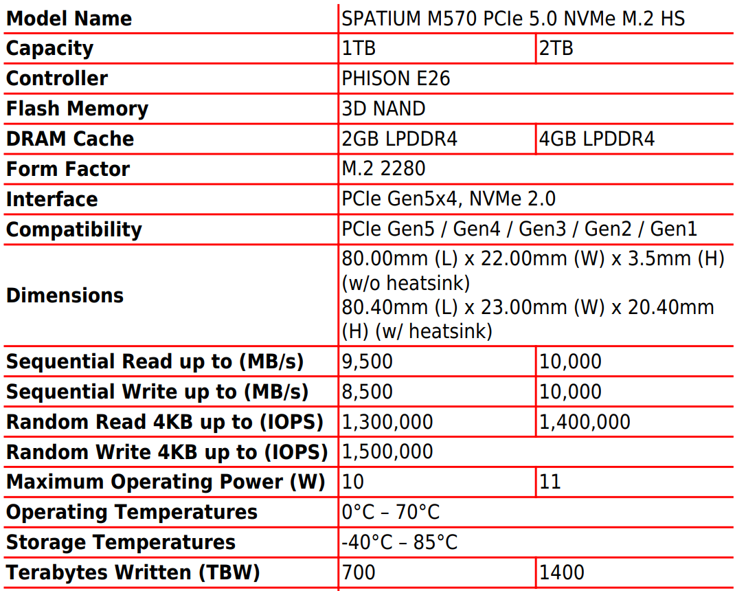 Las unidades MSI Spatium M570 HS NVMe se basan en la plataforma Phison PS5026-E26 y los chips de memoria 3D NAND TLC. Se declara una velocidad de lectura/escritura de hasta 10 GB/s, y el nivel máximo de rendimiento cuando se trabaja con bloques arbitrarios es igual a 1,4 millones/1,5 millones de IOPS (lectura/escritura). Por cierto, MSI también está preparando SSD Spatium M570 Pro, en el que la velocidad de lectura alcanza los 12 GB/s.